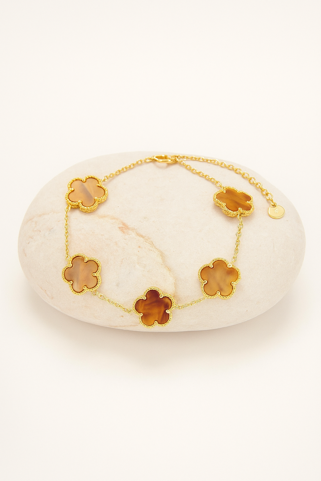 Ce bracelet raffiné se compose de cinq motifs trèfle en nacre aux reflets ambrés, chacun serti d’un contour doré délicatement perlé. La chaîne fine en acier doré souligne la légèreté du bijou, tandis que les nuances chaudes apportent une touche de lumière et d'élégance naturelle. Parfait pour illuminer votre poignet au quotidien comme lors d’occasions spéciales.