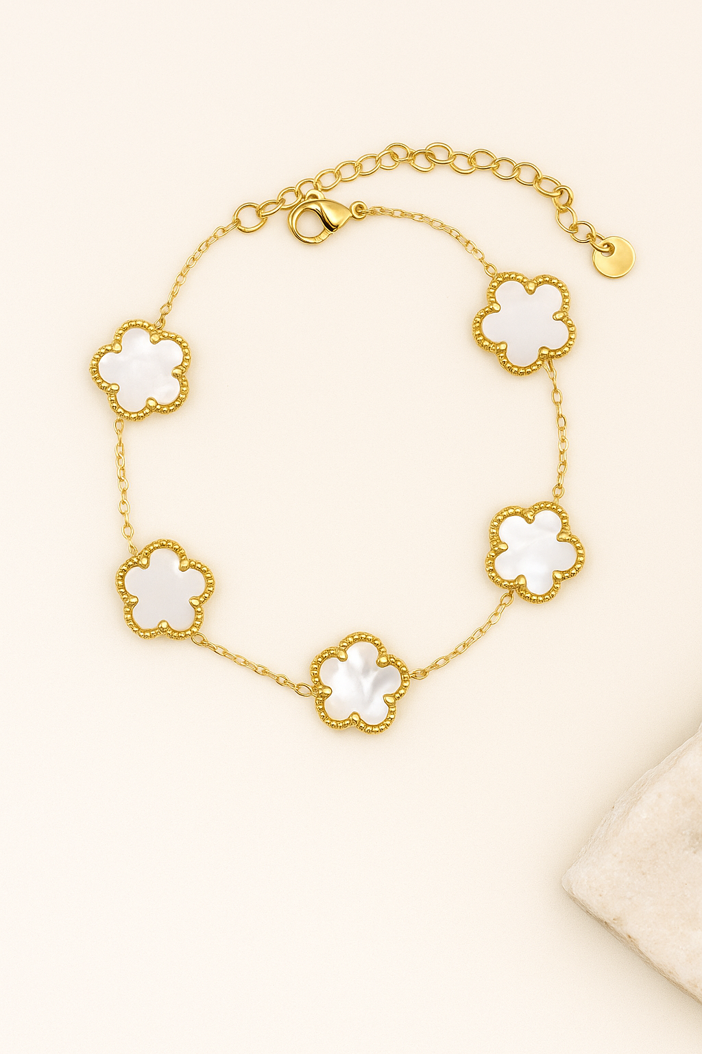 Le bracelet Éclat Nacré incarne l'élégance intemporelle avec ses cinq trèfles en nacre lumineuse, délicatement sertis sur une chaîne dorée raffinée. Parfait pour sublimer une tenue de tous les jours ou pour illuminer une occasion spéciale, ce bijou allie douceur et éclat dans un design minimaliste et raffiné.
