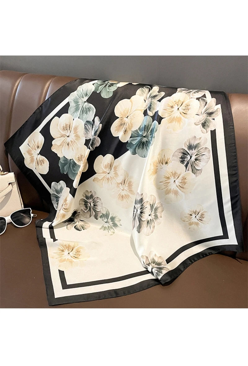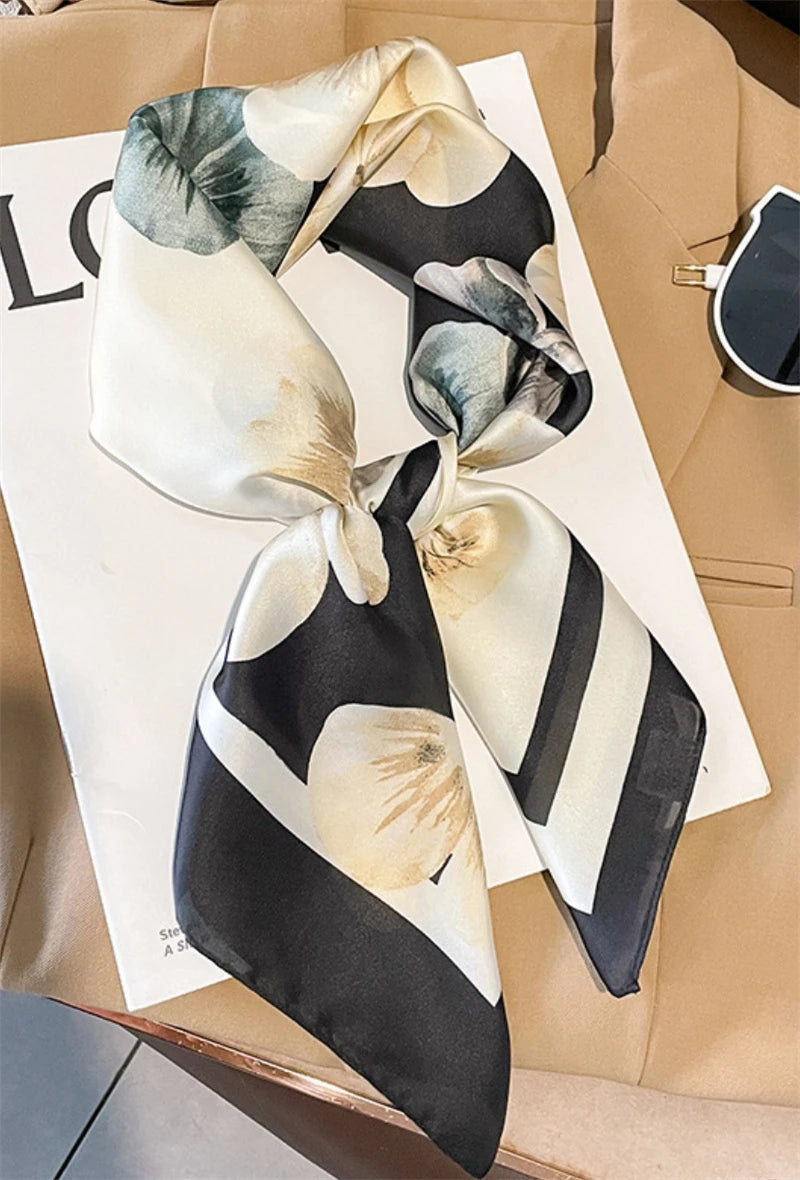Ce foulard en satin de soie marie à la perfection douceur florale et élégance graphique. Ses nuances crème, noir profond et touches de vert sauge s’entrelacent dans un motif floral délicat et contemporain. Sa texture fluide et son éclat subtil en font un accessoire de charme, à nouer autour du cou, dans les cheveux ou sur un sac pour une allure chic et intemporelle.