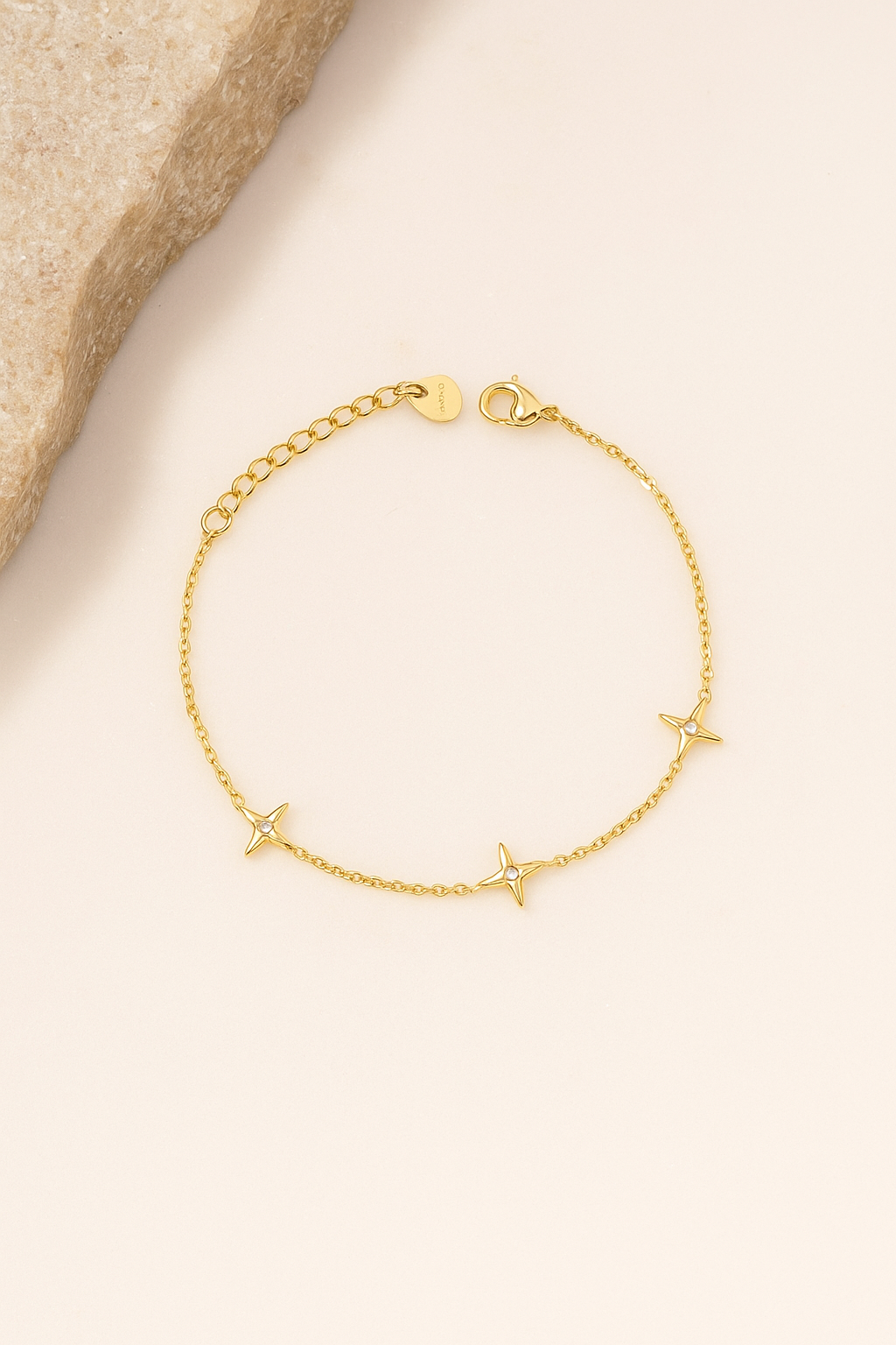 Le bracelet Éclats Solaires incarne l’élégance discrète avec ses trois étoiles dorées, délicatement posées sur une fine chaîne. Chaque étoile scintille d’un éclat subtil, rappelant les premiers rayons du soleil sur une pierre chaude. En acier inoxydable doré, ce bijou léger et raffiné s’adapte à toutes les occasions, du quotidien aux moments les plus précieux.