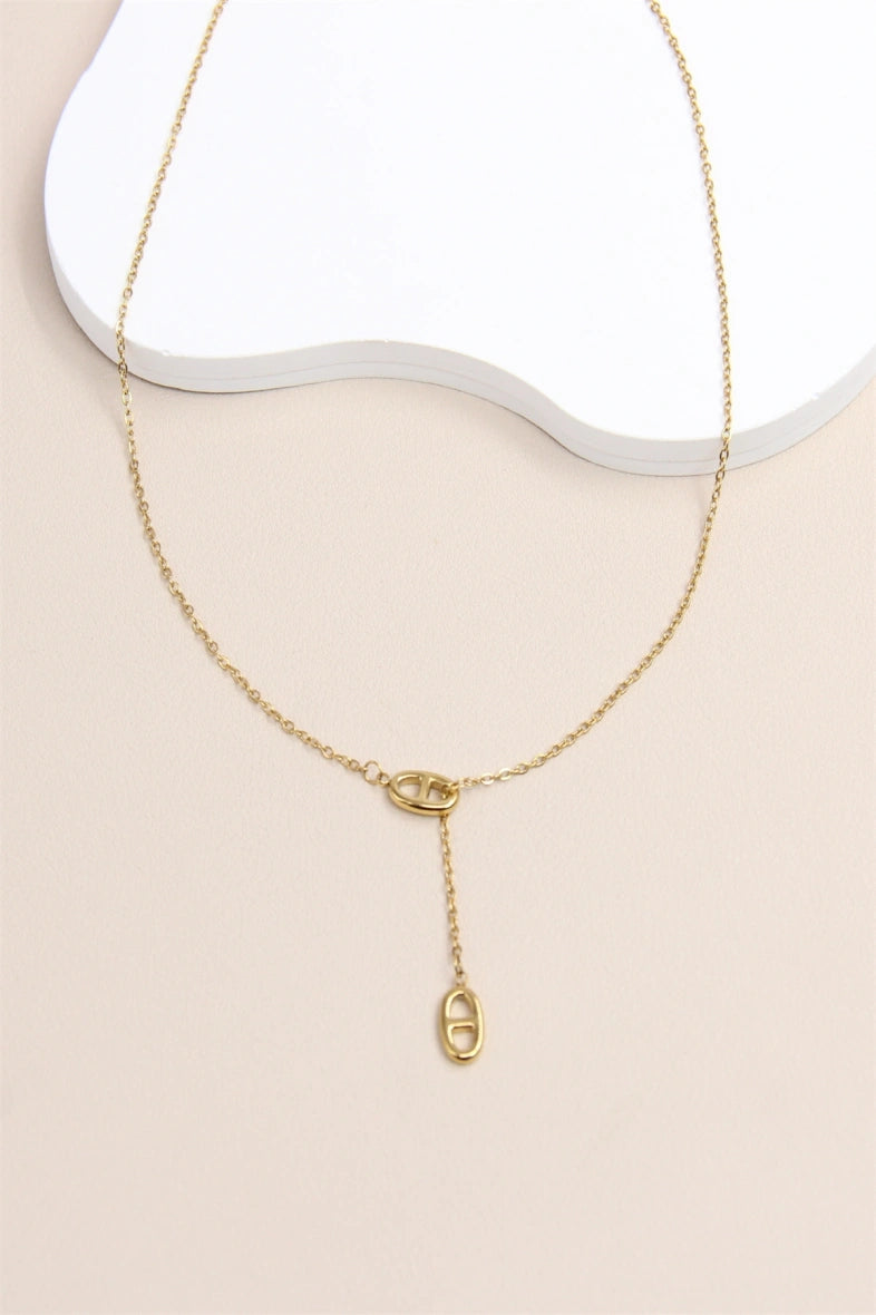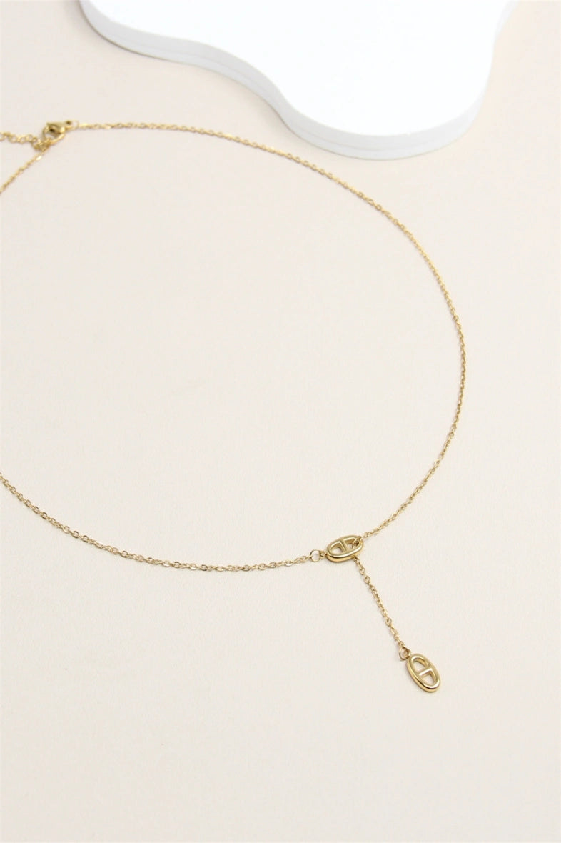 Élégant et raffiné, ce collier en acier inoxydable doré se distingue par son design minimaliste orné de deux maillons ovales. Sa finition brillante et sa finesse en font un accessoire chic, parfait pour sublimer toutes vos tenues au quotidien.