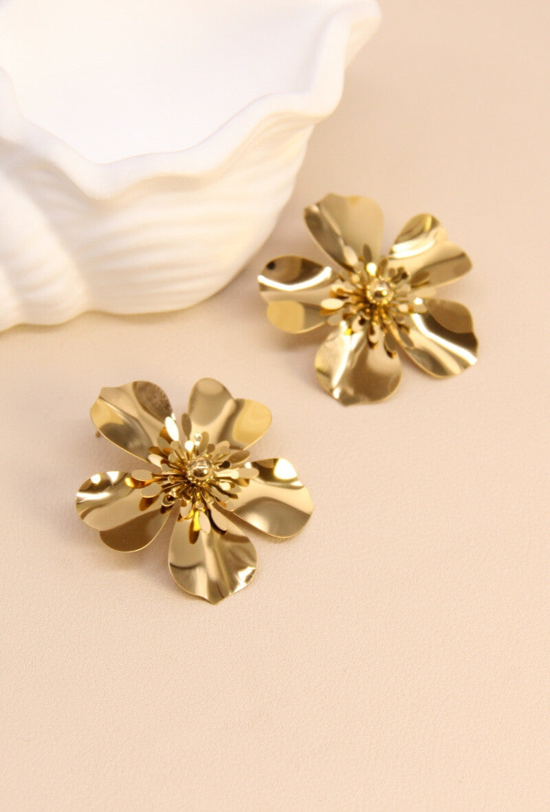 Laissez-vous séduire par ces boucles d’oreilles en acier inoxydable doré, délicatement travaillées en forme de fleurs éclatantes. Leur design sculptural capte la lumière avec élégance pour sublimer votre visage. Hypoallergéniques et résistantes, elles sont idéales pour apporter une touche chic et romantique à vos tenues.