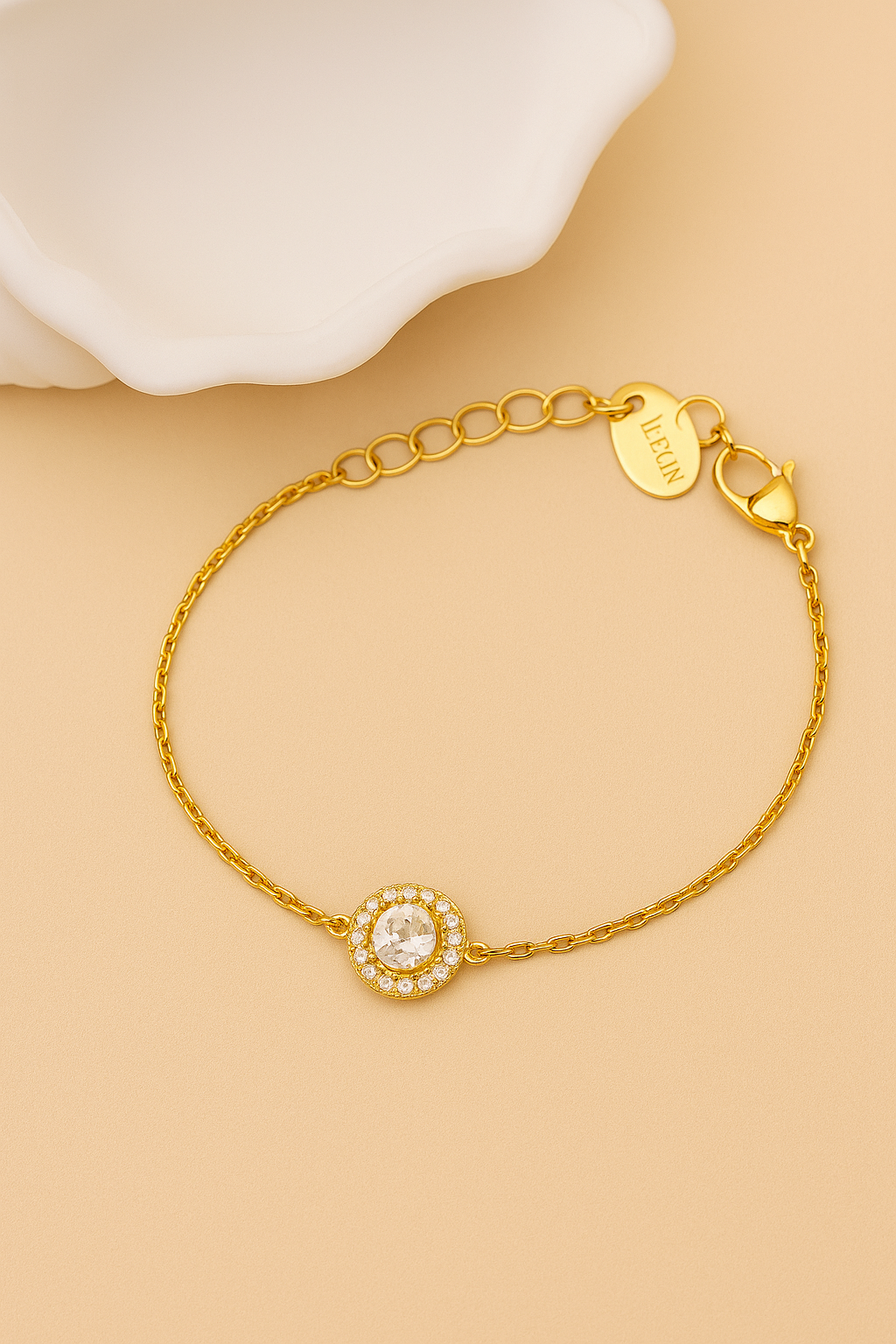 Ce délicat bracelet en acier inoxydable doré est sublimé par un pendentif circulaire orné d'un zircon central étincelant, entouré d'une couronne de petits cristaux brillants. Sa chaîne fine et ajustable épouse parfaitement le poignet, offrant une touche raffinée et lumineuse à toutes vos tenues. Et élégant, il est idéal à porter au quotidien ou pour sublimer résistant une tenue de soirée.